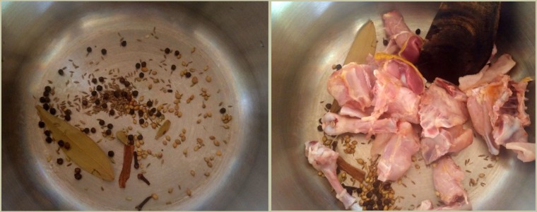 - In a Pressure cooker, dry fry the spices for a few minutes till a nice smell emanates. Lightly crush them using the stone of the motor and pestle.