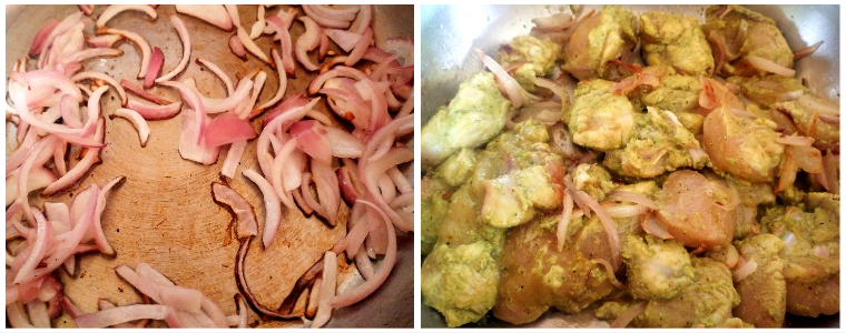 - In a frying pan take 2tbsp of oil and saute the onion. Once it turns pink and fries a bit, add the marinated chicken. Saute till the meat changes color.
