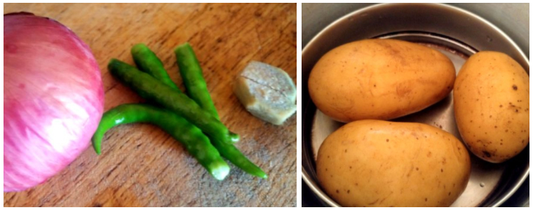 - Pressure cook the potatoes. Slice the onion and ginger to thin longitudinal strips. Slit the chillies