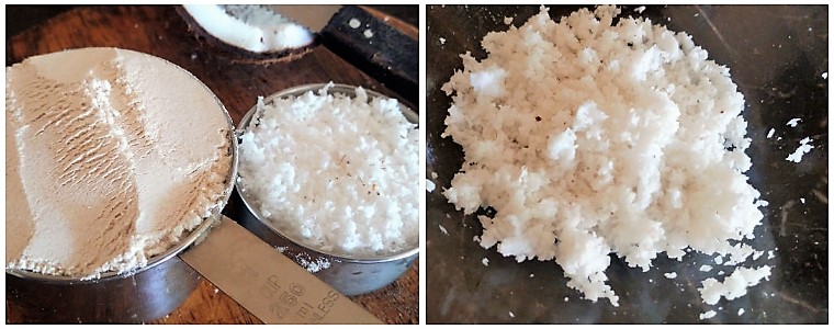 - With the half cup of grated coconut add 1/8 th tsp of salt and 1 tsp of oil and mix well. Then add 1 tbsp of luke warm water and mix well sqeezing the coconut. If you have frozen coconuts thaw it and add hot water instead.