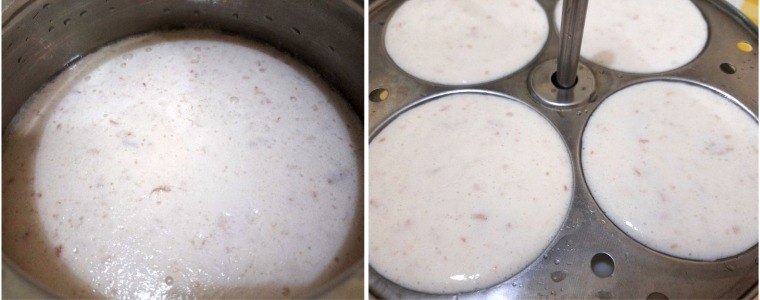 - Once it gets fermented, mix well and check for salt. Pour the batter into idli molds and steam in the idli steamer for 15 minutes.