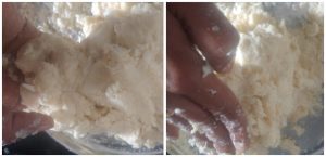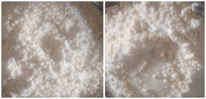 Next add the cold curd to the flour in a scattered pattern. Mix the curd with the flour using your fingers. At this stage most of the dough will be dry. Sprinkle water as needed to make a coarse dough. For 3 cups of flour I needed around 1/2 cup of water.