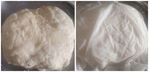 Start patting by picking up the dry flour and pressing onto the centre. Keep doing this till you see no more dry flour. The dough will look rough. Cover it with a wet cloth and let it rest for 15 minutes.