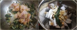 When the onion starts to slightly brown up, roughly chop the greens and add it to the onion. Saute well for a few minutes till the leaves shrink in size. Next, add the chicken and saute it till the meat changes color.