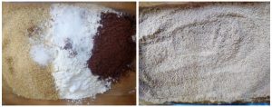Mix the coffee powder with the water and keep ready. Make two wells or depressions in the flour- 1 big and 1 small.