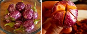 Chop the brinjals from the bottom to 3/4th up, leaving it held at the stalk. You can make either an 'X' cut or an asterisk cut. Check for worms and keep the brinjals soaked in water.