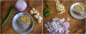 Chop the onion, garlic, chilly, and the green leaves and keep them ready.