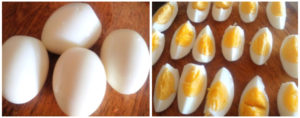 Boil the eggs, peel them and cut them into quarters.
