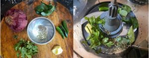 Soak the chana dal for 2 hours in sufficient quantity of water. Roughly pulse the ingredients from chillies to asafoetida in the list above.