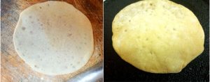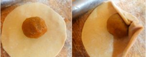 Roll out the dough into a small circle. Keep the puran ball in the center and cover it completely with the dough.
