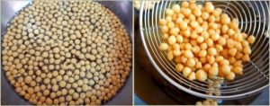 In a wide pan heat up the oil in medium-low heat. Check the heat by dropping a few drops of the batter in the oil. If it comes up immediately the oil is hot enough.