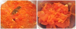 When it gets fried add grated carrots, saute for a minute, and add the chopped tomatoes. Add 1/2 tsp of salt and 1 tsp of sugar and saute for a few minutes.